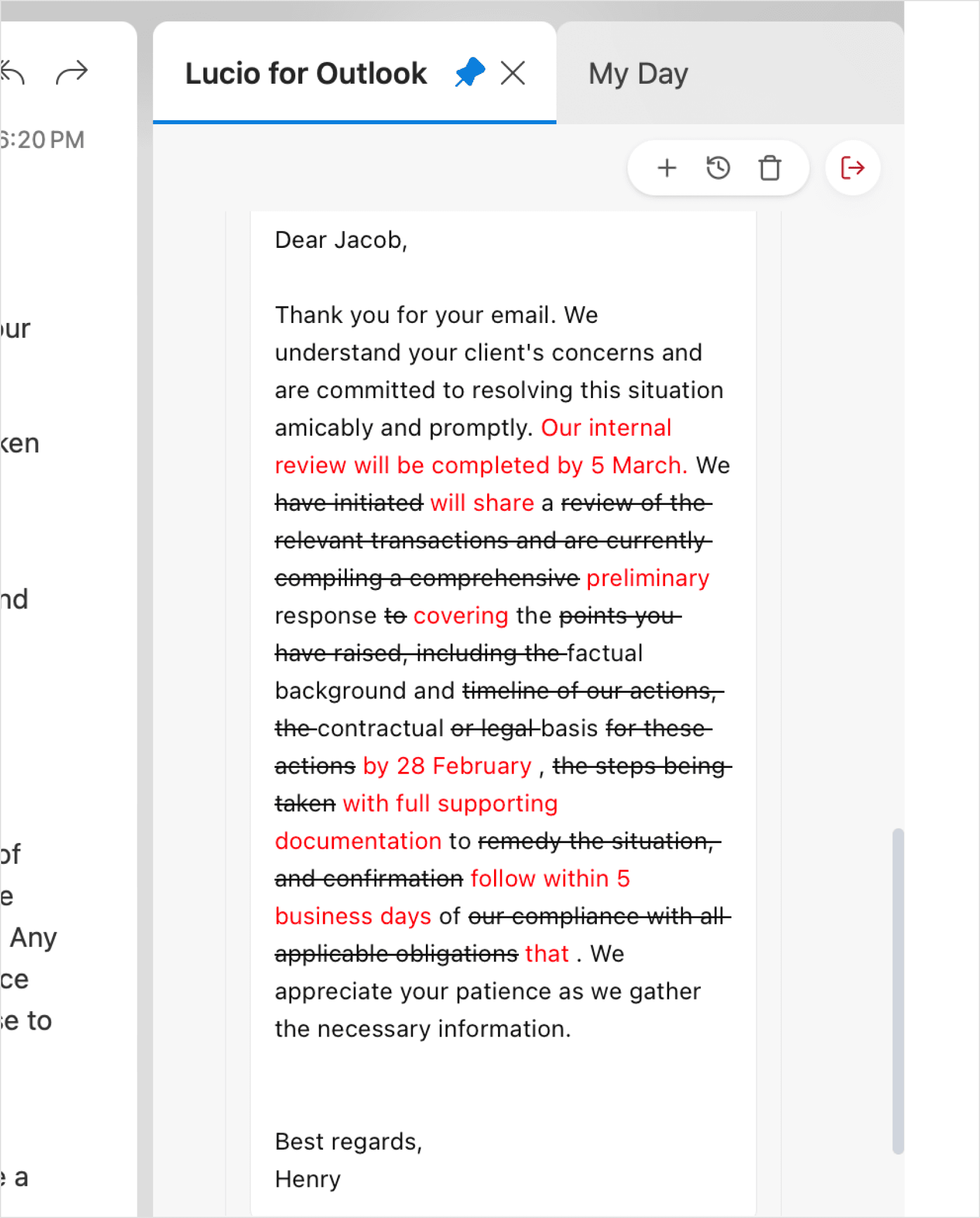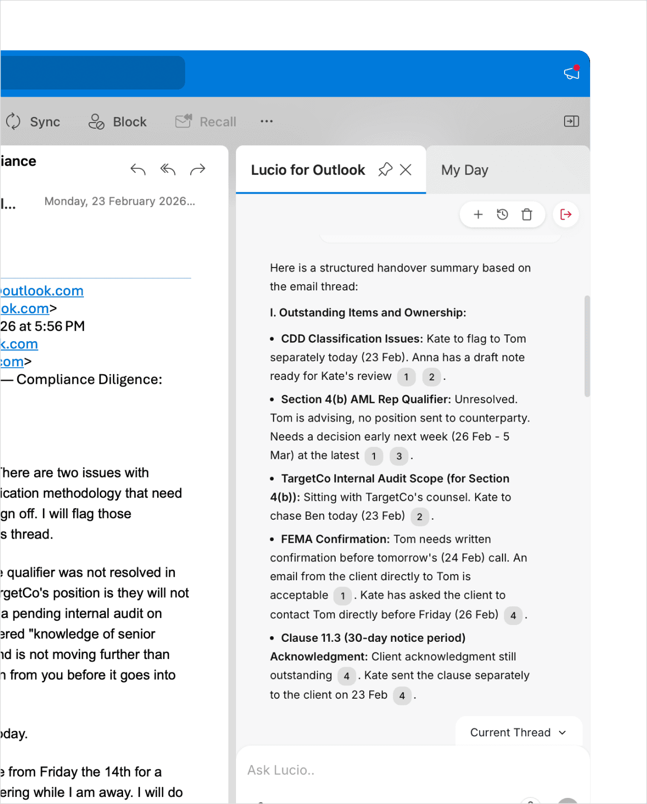 Draft full or inline replies from the inbox, handle multi-question emails, adjust tone, and review AI edits in redline without leaving Outlook.