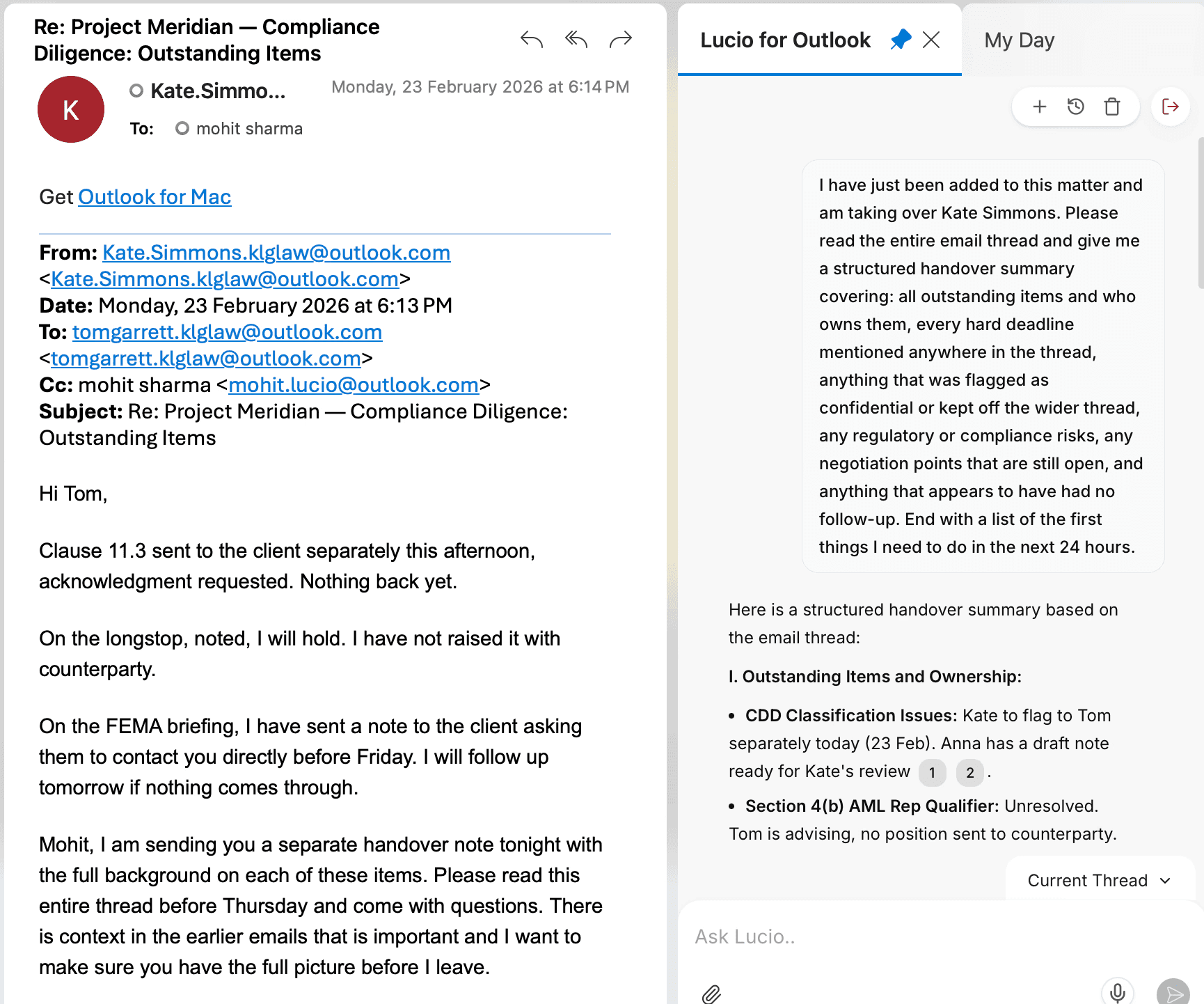 Search across emails and attachments to track how instructions and positions evolve over time.