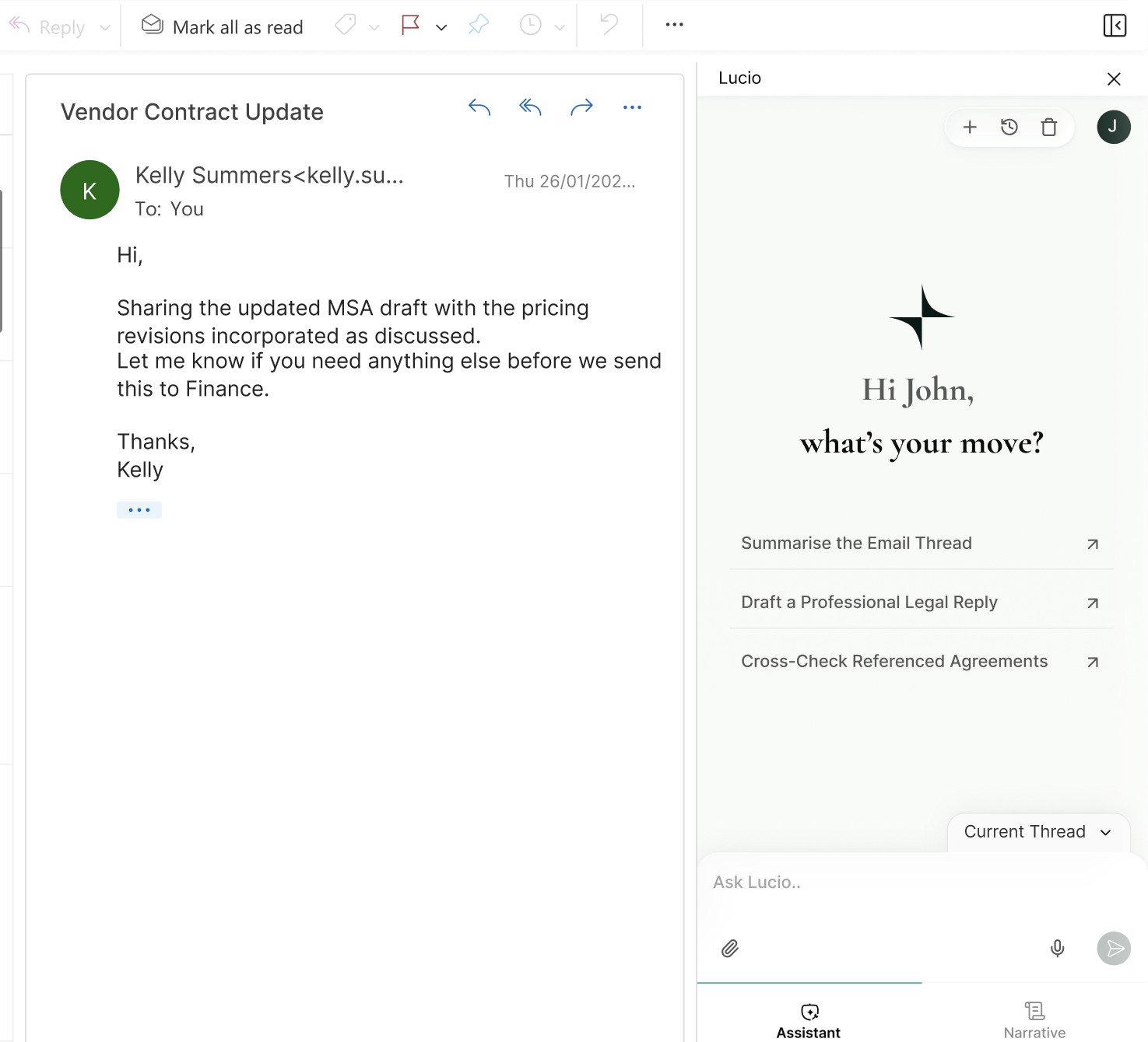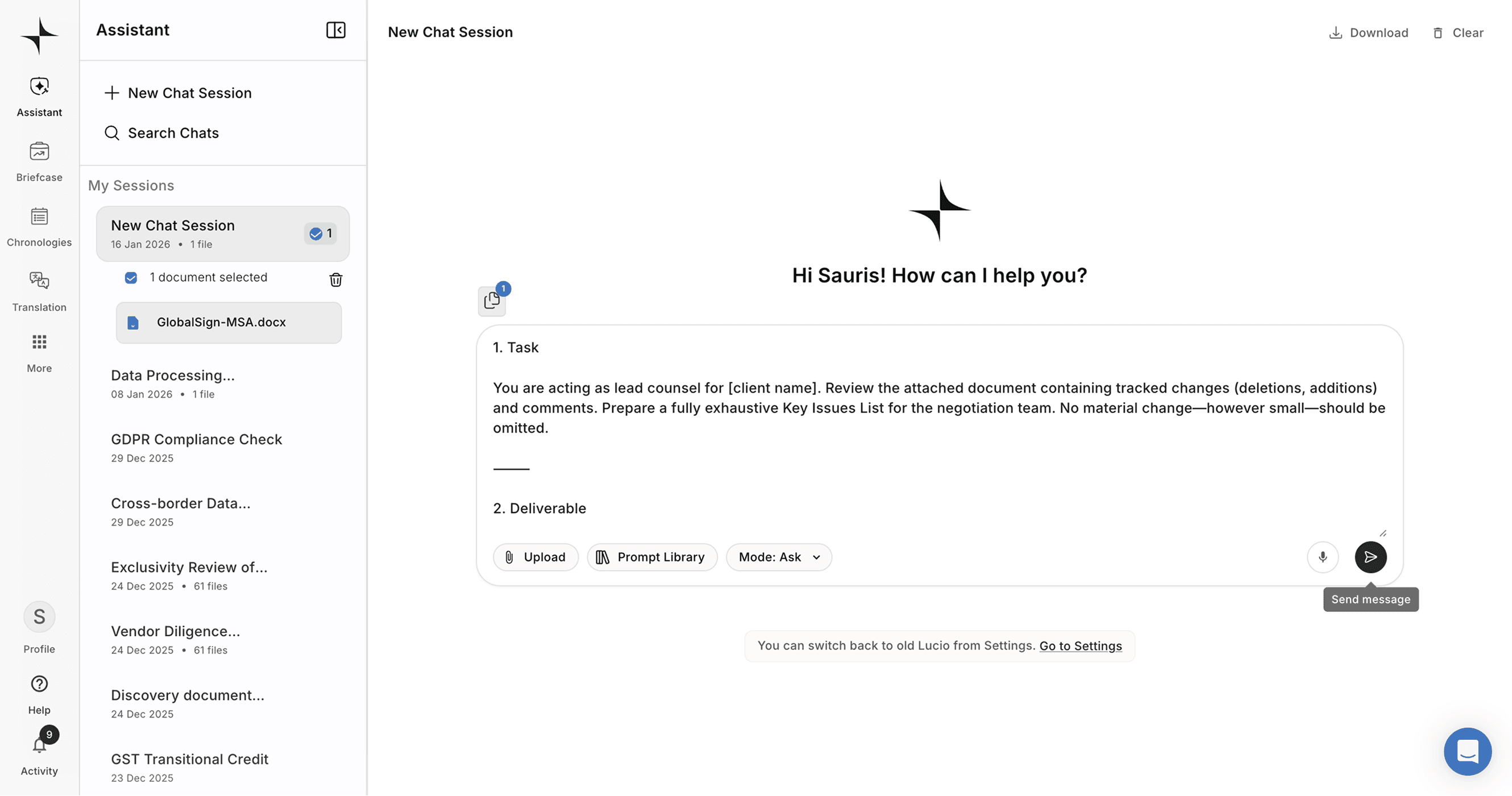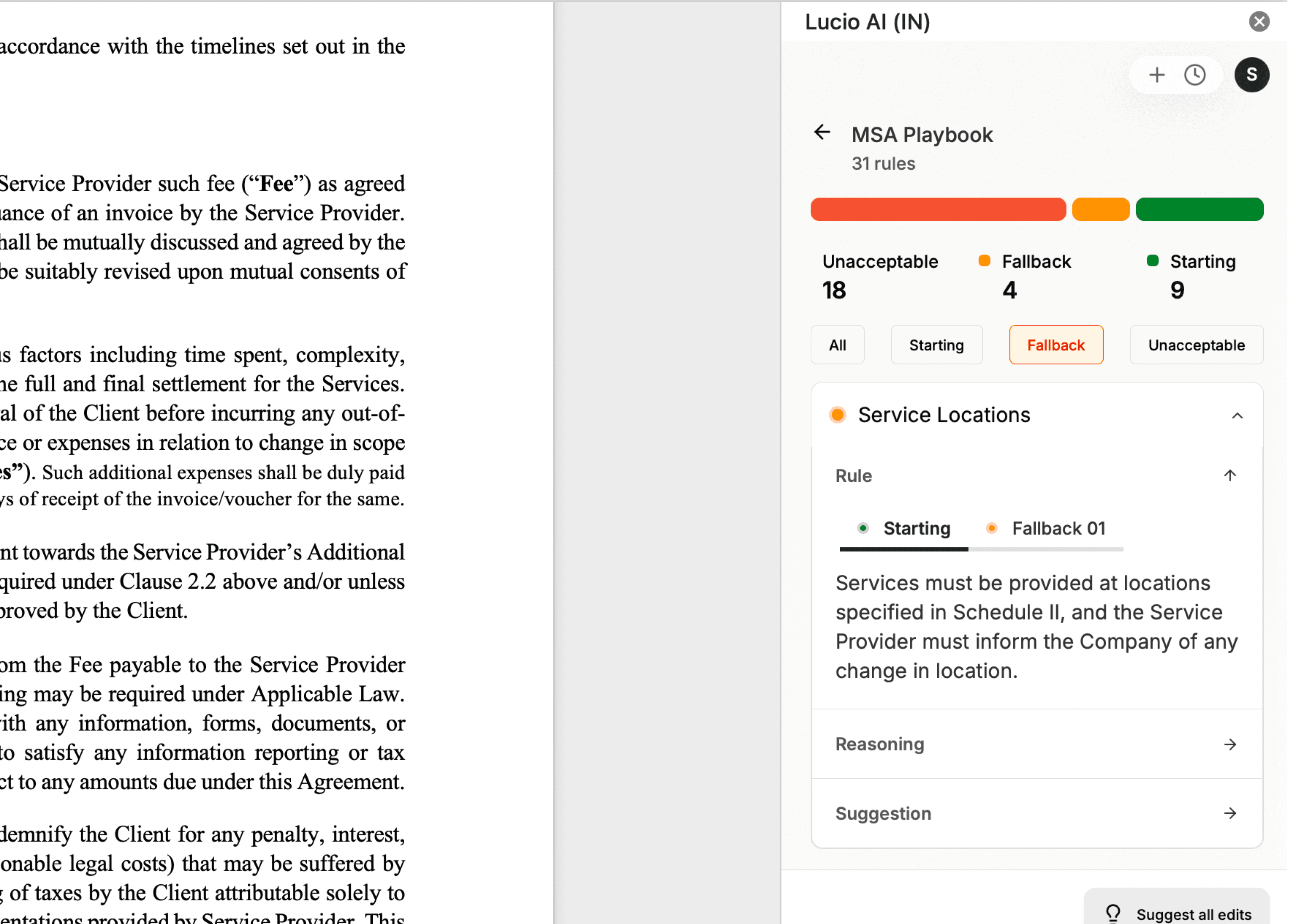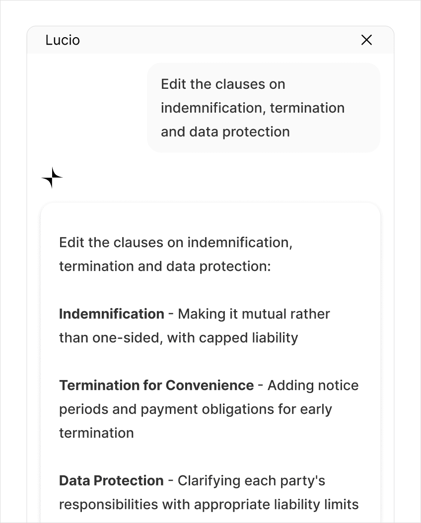 Generate clauses and revisions directly in Word. Lucio inserts them as tracked redlines, so you can accept, reject, or refine every change.